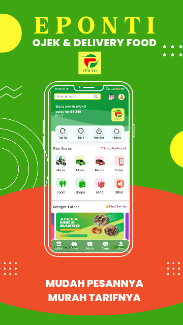 EPONTI TRANS merupakan aplikasi menyedia layanan Transportasi, Delivery, Food, Shope dan Ppob Pulsa yang bisa di pesan secara online dengan mudah dan harga murah serta tarif terjangkau.